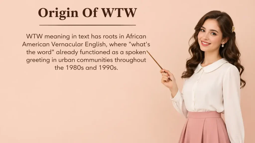 WTW meaning in text has roots in African American Vernacular English, where “what’s the word” already functioned as a spoken greeting in urban communities throughout the 1980s and 1990s. The phrase meant “what is happening” or “what is the news” and carried a cool, effortless energy that distinguished it from more standard greetings. It was a way of saying “fill me in” without sounding overly eager.